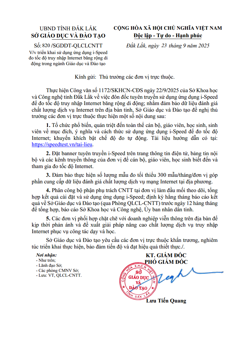 Thực hiện CV Số: 820/SGDDT-QLCLCNTT Đắk Lắk, ngày tháng 9 năm 2025, V/v triển khai sử dụng ứng dụng i-Speed đo tốc độ truy nhập Internet băng rộng di động trong ngành Giáo dục và Đào tạo.